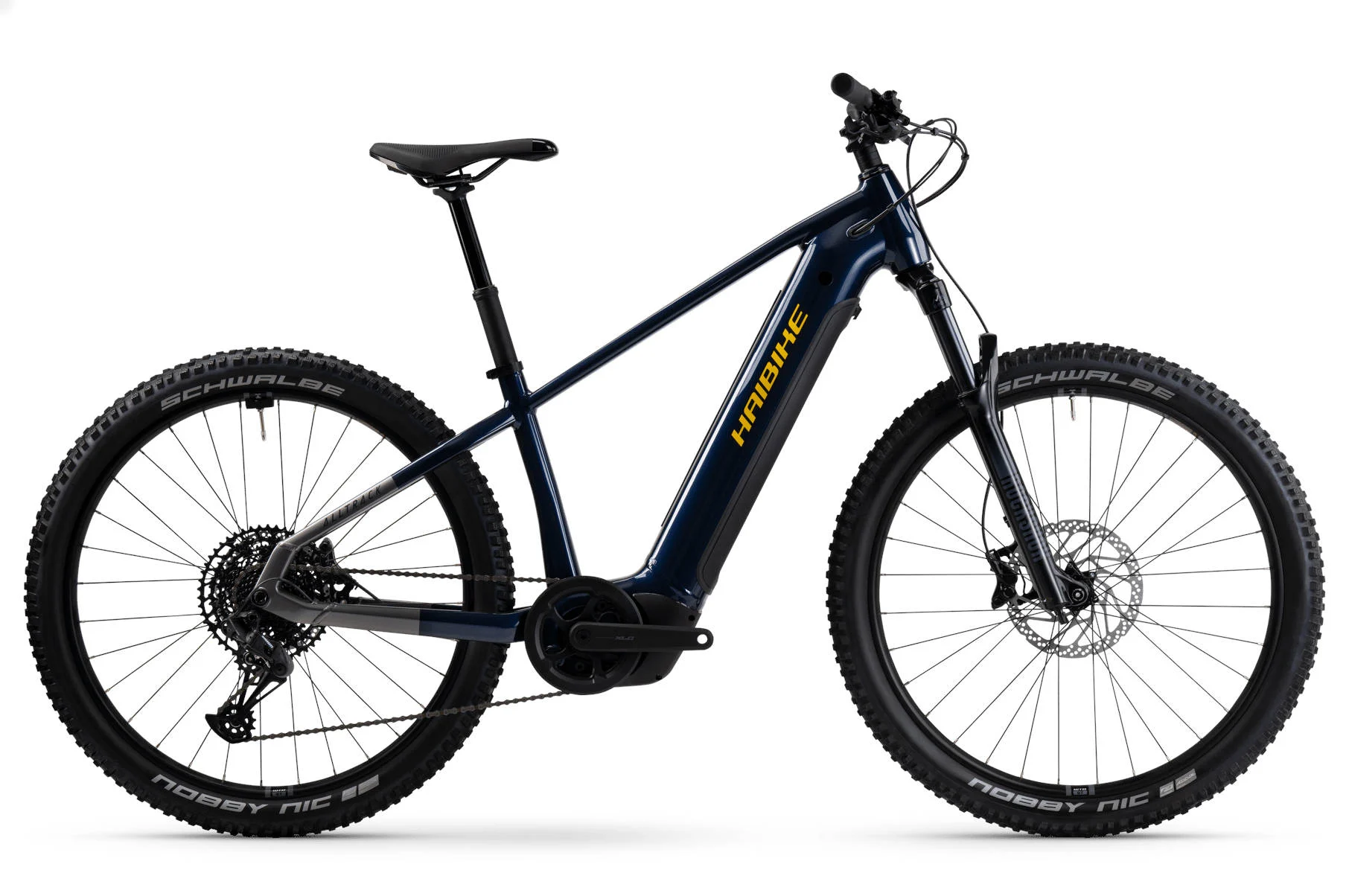Haibike ALLTRACK 10 je vrhunsko električno gorsko kolo z robustnim aluminijastim okvirjem in zmogljivim motorjem Bosch Performance CX GEN5 (85 Nm). Opremljen je z 800 Wh baterijo, vzmeteno vilico RockShox 35 Silver (120 mm), 4-batnimi hidravličnimi zavorami Shimano MT420 in prestavnim sistemom SRAM SX Eagle (1×12). Pnevmatike Schwalbe Nobby Nic Performance zagotavljajo odličen oprijem, medtem ko kompaktni zaslon Bosch Purion omogoča enostaven nadzor.