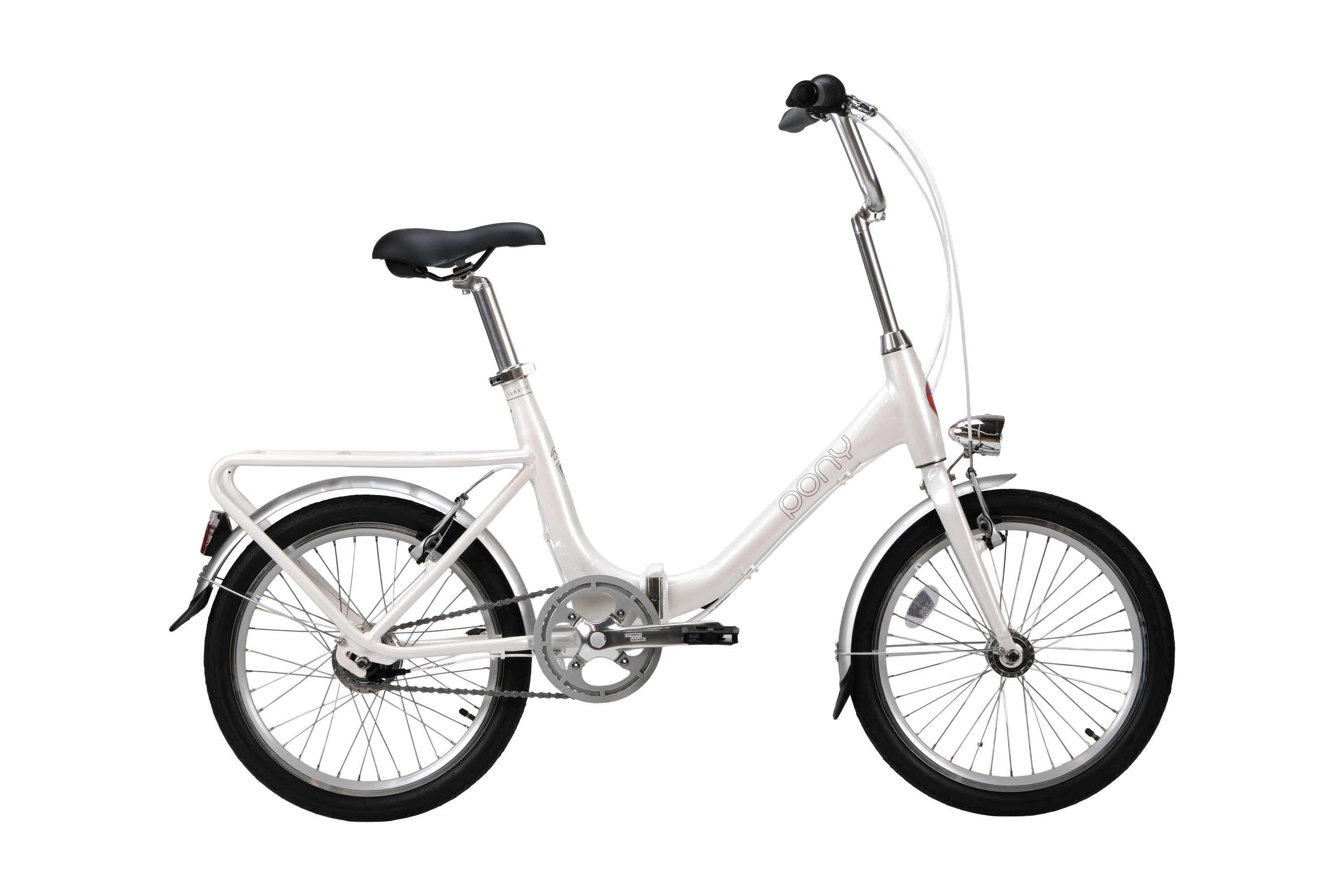 Odsevniki in dve električni LED luči poskrbita, da je kolesarjenje varno tudi v nočnem času. Privlačna oblika prenovljenega Ponyja pa, da se bodo za vami obračale glave. Zložljiv okvir Ponyja omogoča preprosto shranjevanje. Medtem, ko ga ne rabite, se lahko zloži v omaro, avtomobilski prtljažnik ali garažo in tam počaka na nove avanture.